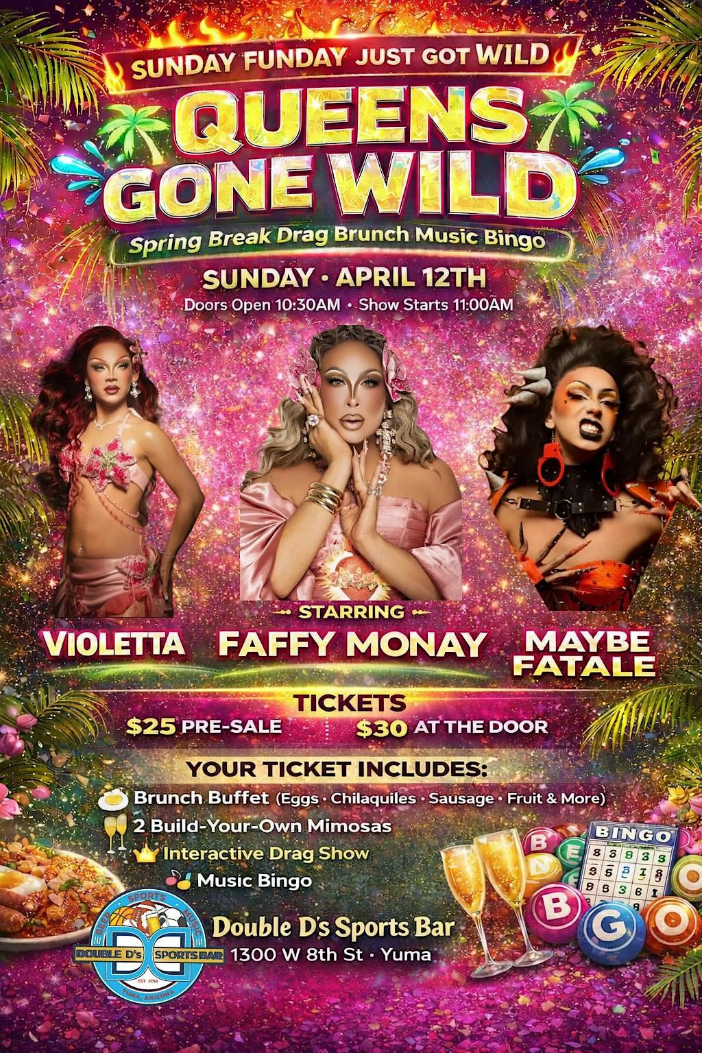 Get ready for the wildest Sunday Funday in Yuma! ๐๐ด Queens Gone Wild is a Spring Breakโthemed Drag Brunch Music Bingo experience happening Sunday, April 12th at Double Dโs Sports Bar. Doors open at 10:30AM and the show kicks off at 11AM.