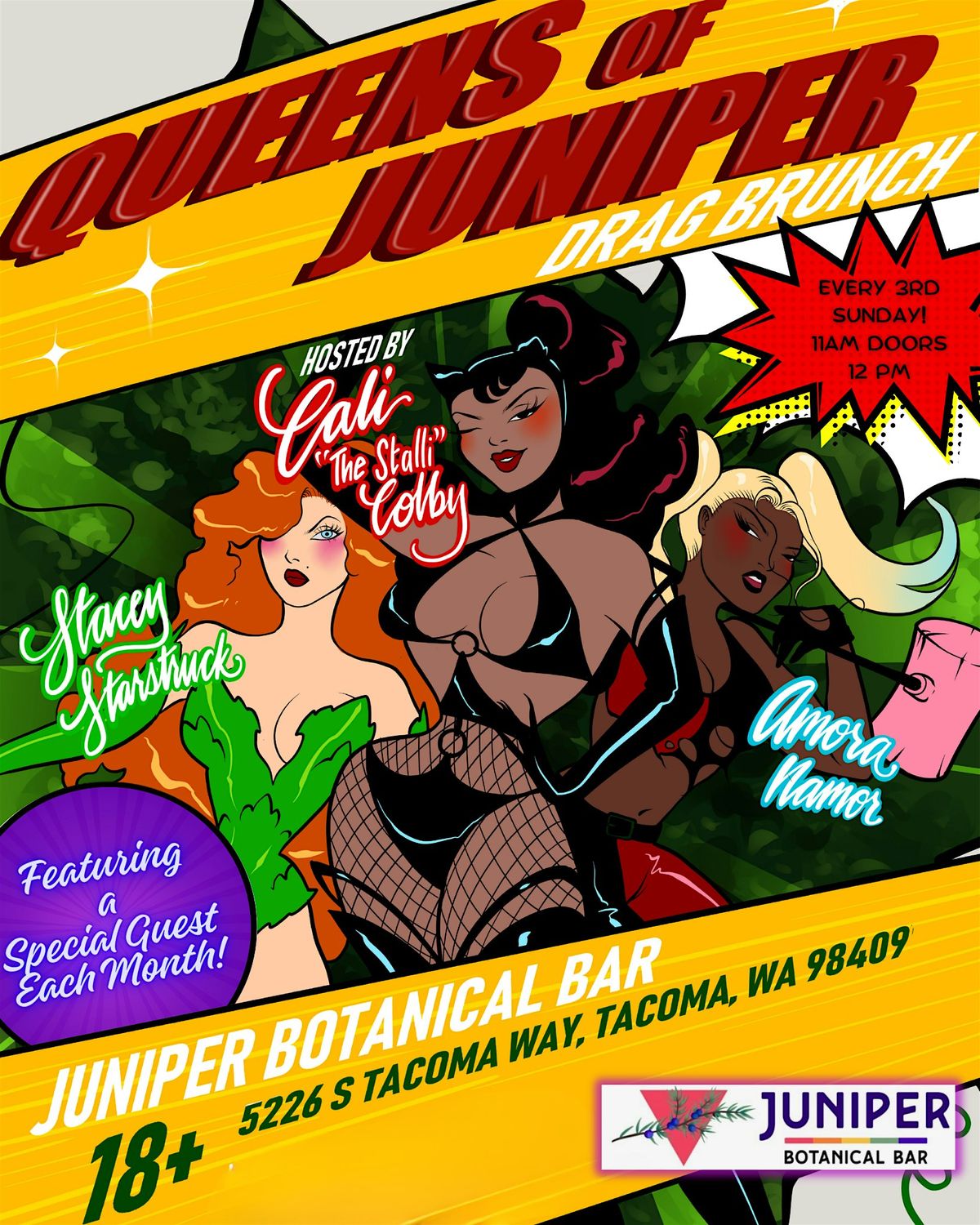 Catch Tacoma’s hot new drag brunch every third Sunday, at Juniper Botanical Bar! Hosted by Cali Colby and featuring Stacey Starstruck, Amora Namor, plus a special guest each month.
