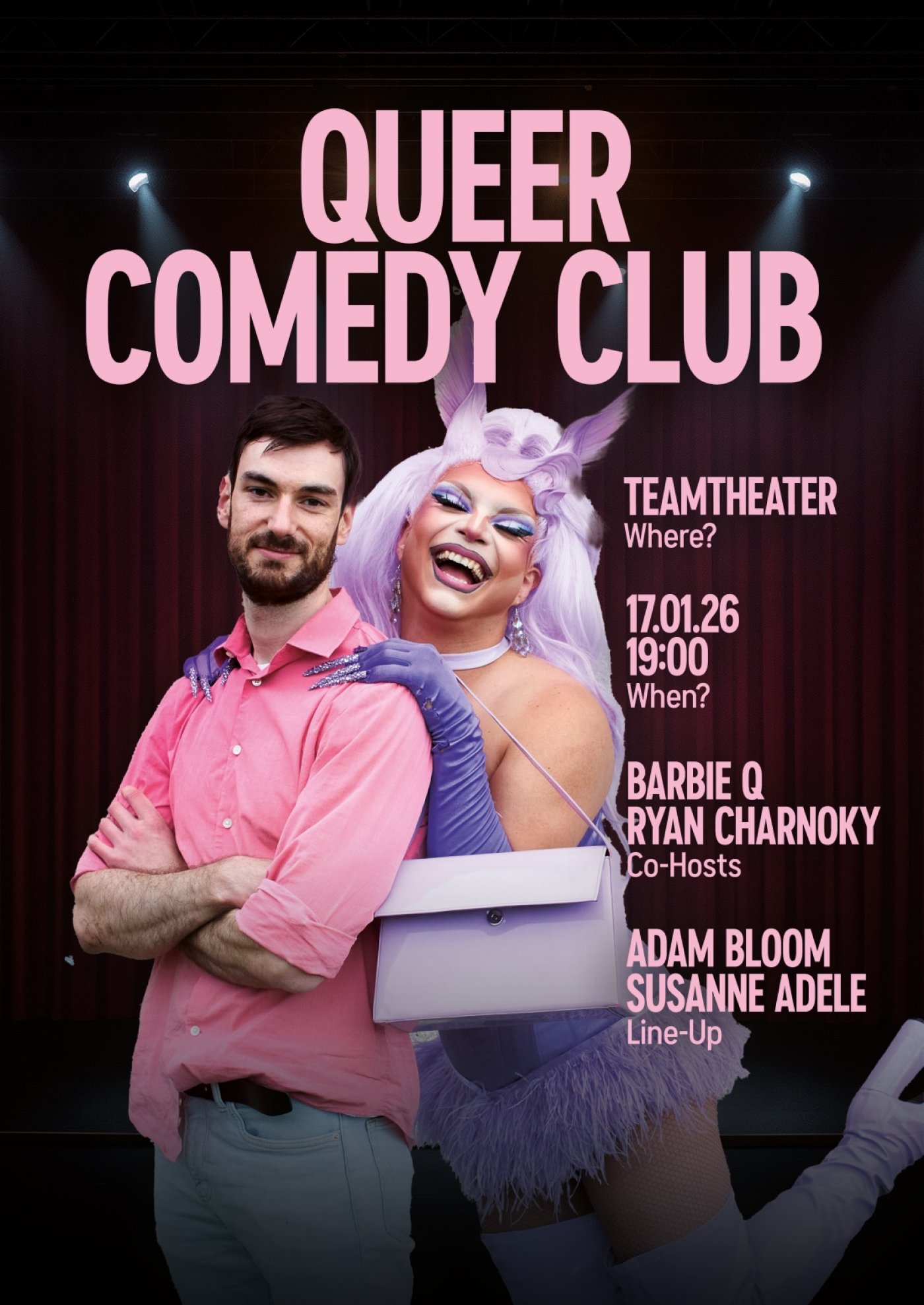 On January 17th, 2026, the Queer Comedy Club returns to Teamtheater Munich — louder, queerer, and legally funnier than the last version. This time more international!