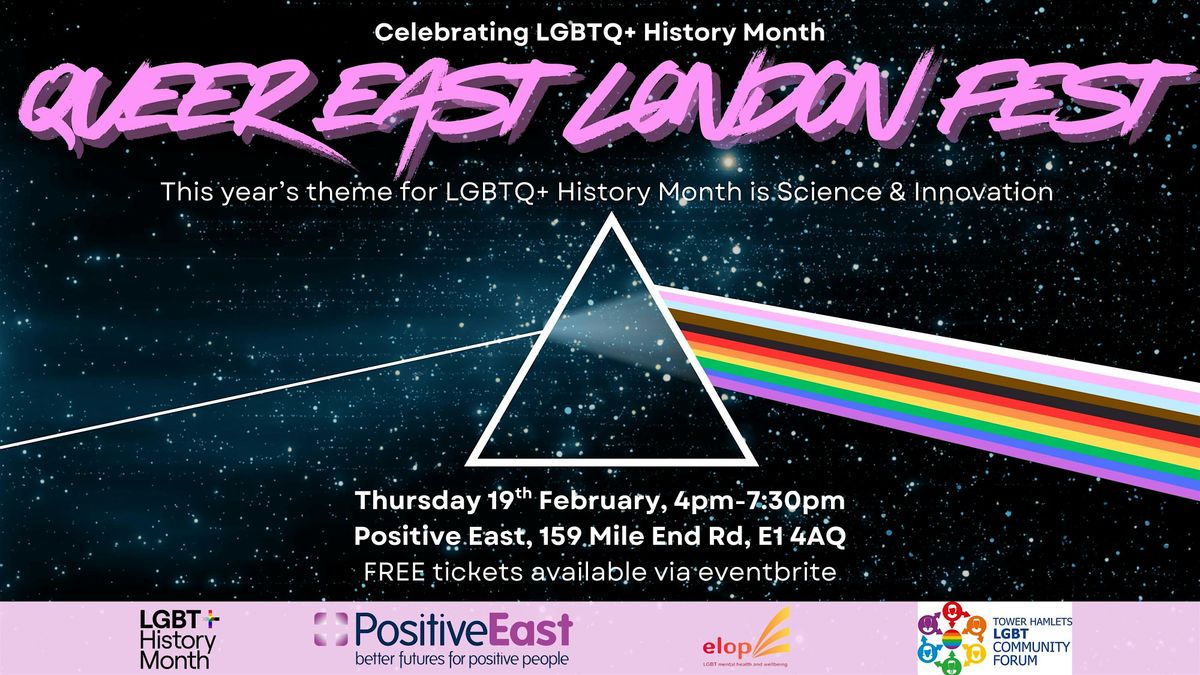 Welcome to the Queer East London Fest for LGBTQ+ History Month! Join Positive East, elop and the Tower Hamlets LGBTQ+ Community Forum for a celebration of queer culture, art, and community right here in the heart of East London. Come along for an evening filled with activities, workshops, a community marketplace and a pop-up cinema!