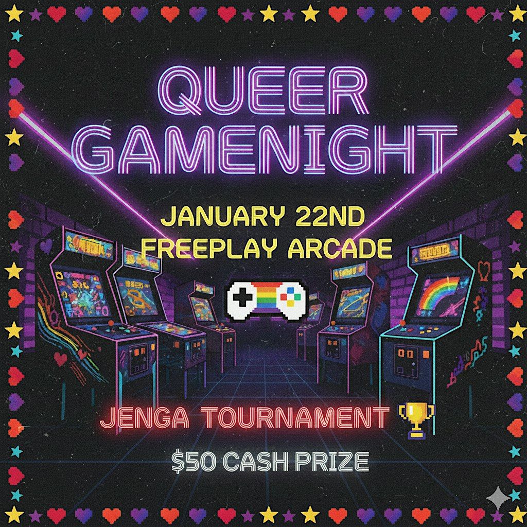Join us for unlimited acade and board games all night, come mingle in a queer safe space.