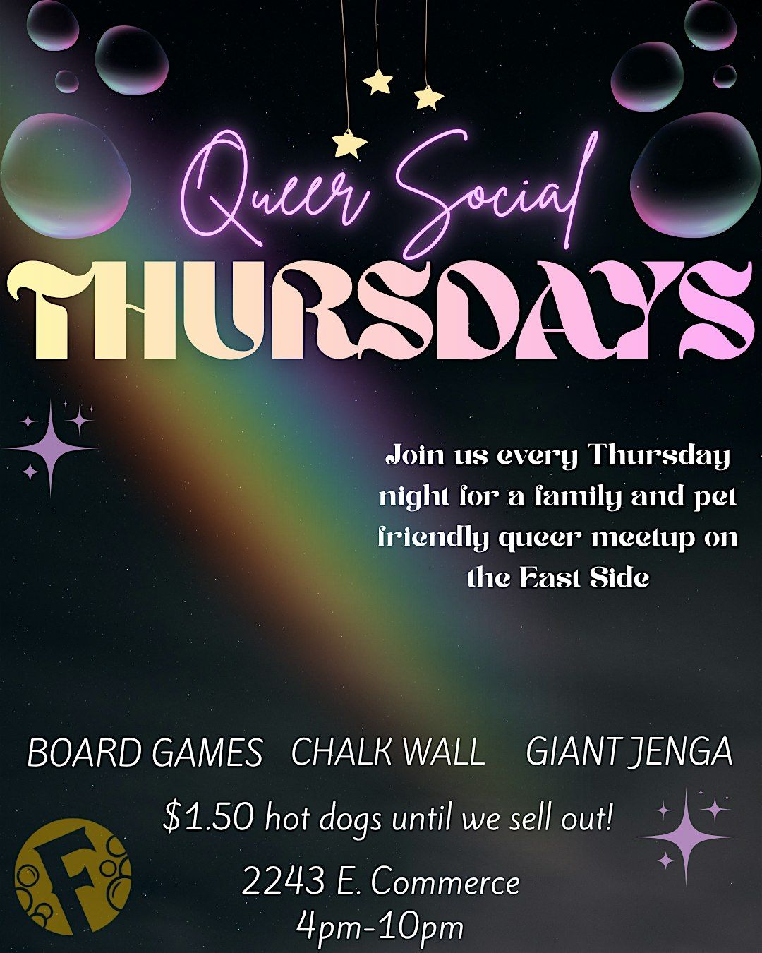 Bring your friends, kiddos, and fur babies for a cozy, colorful evening at Fermenteria Taproom! Queer Social Thursdays is a laid-back, family- and pet-friendly hangout where queer folks, allies, and community members come to connect, create, and have a good time.