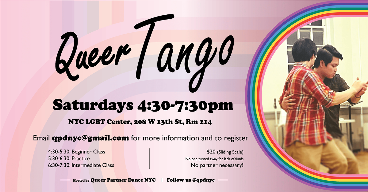Learn how to tango in a welcoming and gender inclusive space, geared toward members of the LGBT community. Join us every Saturday for our classes, which will cover the fundamentals of tango and get you moving on the dance floor! No partner or experience necessary.