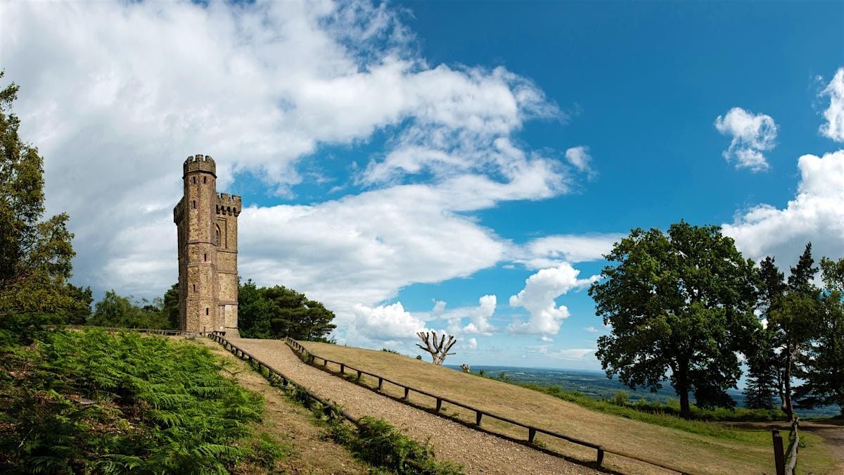 Leith Hill summit viewpoint: The big payoff. We’ll climb to Leith Hill for wide, sweeping views across the Surrey Hills (and beyond on a clear day).