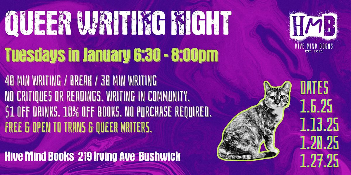 Bring your work-in-progress, or the muse and a blank page, and write in quiet community in our cozy bookstore. This is an event specifically for queer and trans writers. We'll write for 40 minutes, break for 15 minutes, and then write for another 30 minutes. (Totally fine to leave after 40 minutes if you're done.) No critiques, no readings, just focused time to write.