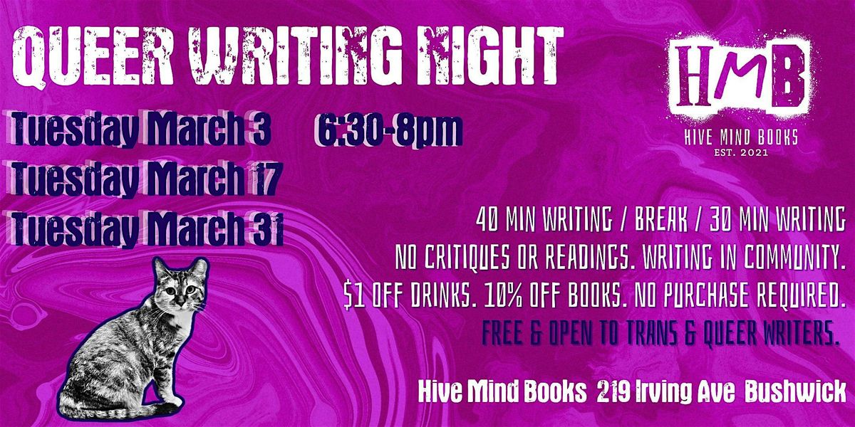 Bring your work-in-progress, or the muse and a blank page, and write in quiet community in our cozy bookstore. This is an event specifically for queer and trans writers. We'll write for 40 minutes, break for 15 minutes, and then write for another 30 minutes. (Totally fine to leave after 40 minutes if you're done.) No critiques, no readings, just focused time to write.