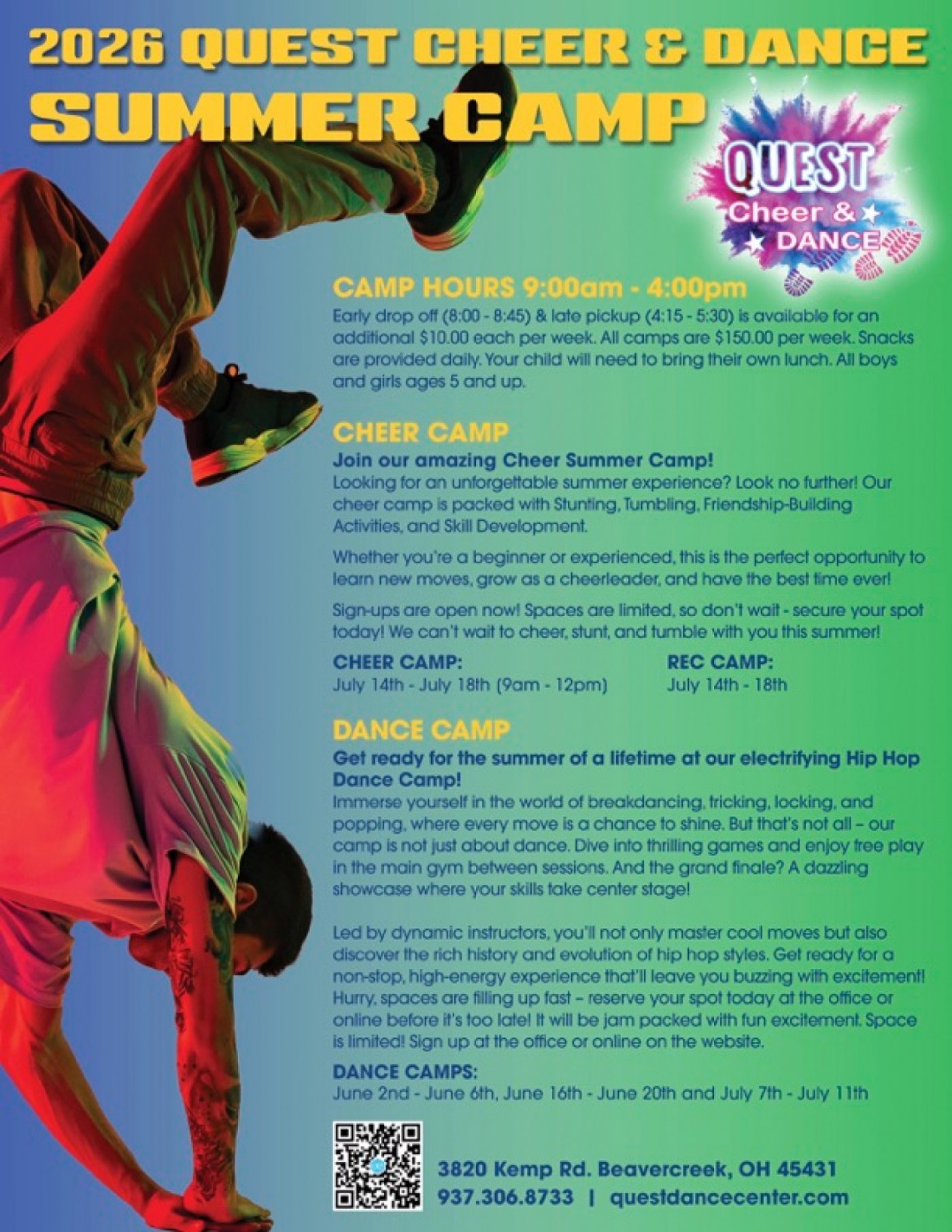 Step into the world of rhythm and enthusiasm at the Quest Summer Dance and Cheer Camps 2026 hosted by Quest Dance Center. Join us for a thrilling week filled with dance, cheerleading, breakdance, tumbling, and endless fun!