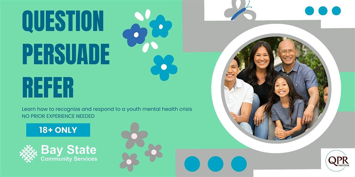 Join us in person for this hands-on event designed especially for caregivers, parents, youth workers, nurses, teachers, and others who interact with youth. Learn how to spot signs, ask the right questions, and offer genuine support for youth going through mental health challenges - and how to connect them to resources that can help them further. Don't miss out on gaining these valuable skills in a friendly, informal setting! This event is for adults only, and street parking is available as well as a small lot for the Quincy Family Resource Center. You can text 617 837 1444 for more information, or email [email protected]. This event is FREE - No prior experience is needed - light refreshments provided.