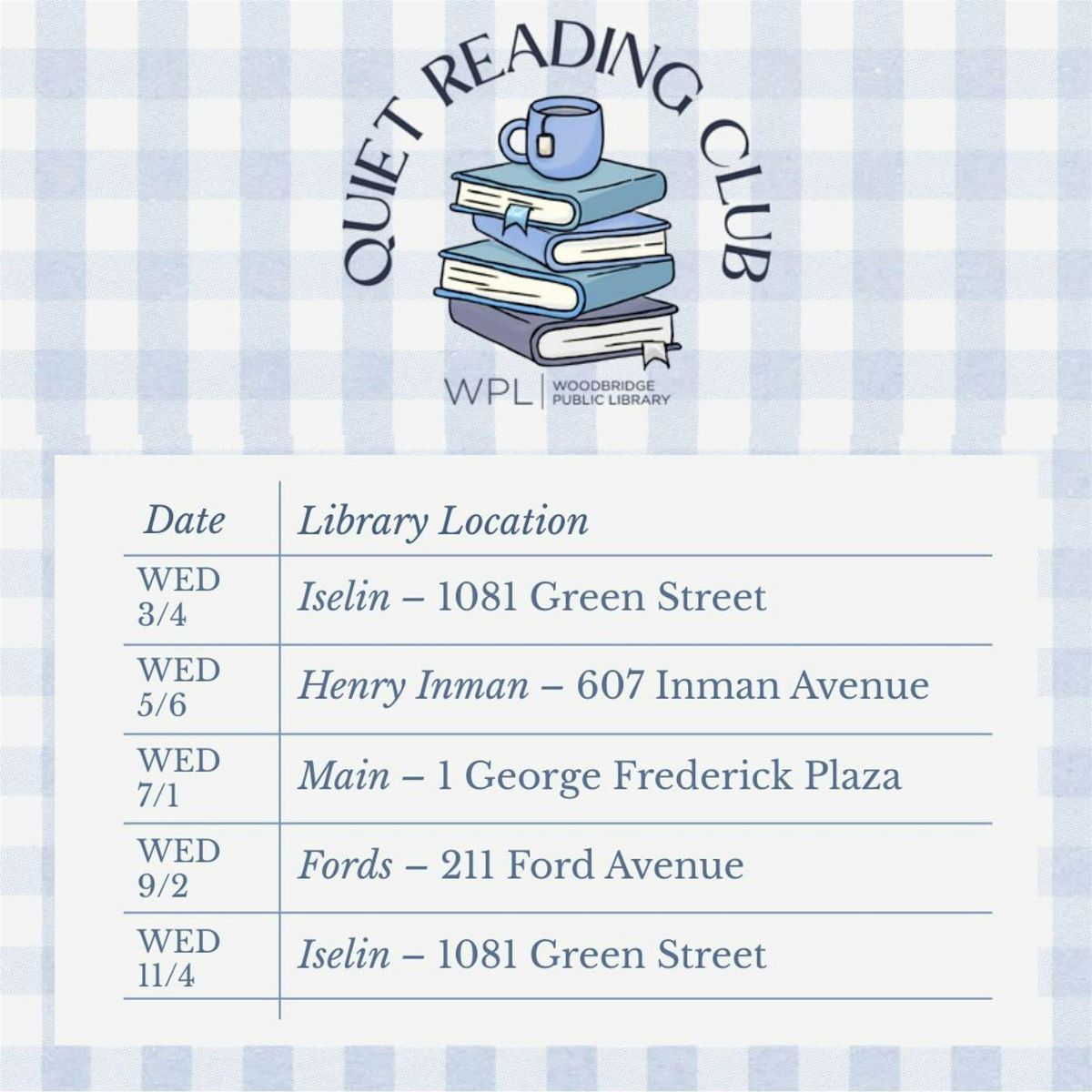 Join WPL for Quiet Reading Club at the Iselin Branch Library on March 4! Mingle over light refreshments from 6:30-7 PM, then settle in for 60 minutes of quiet, independent reading time with your book of choice. For ages 13 and over.