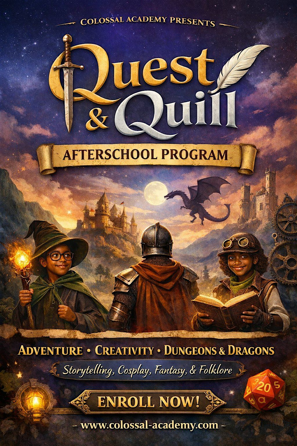 Quest & Quill is a creative afterschool club for middle schoolers where students explore storytelling, world-building, and Dungeons & Dragons–style role-playing together. Students build characters, write creatively, solve problems, and practice teamwork—no prior experience needed. Come ready to imagine, create, and adventure in a welcoming, inclusive community.