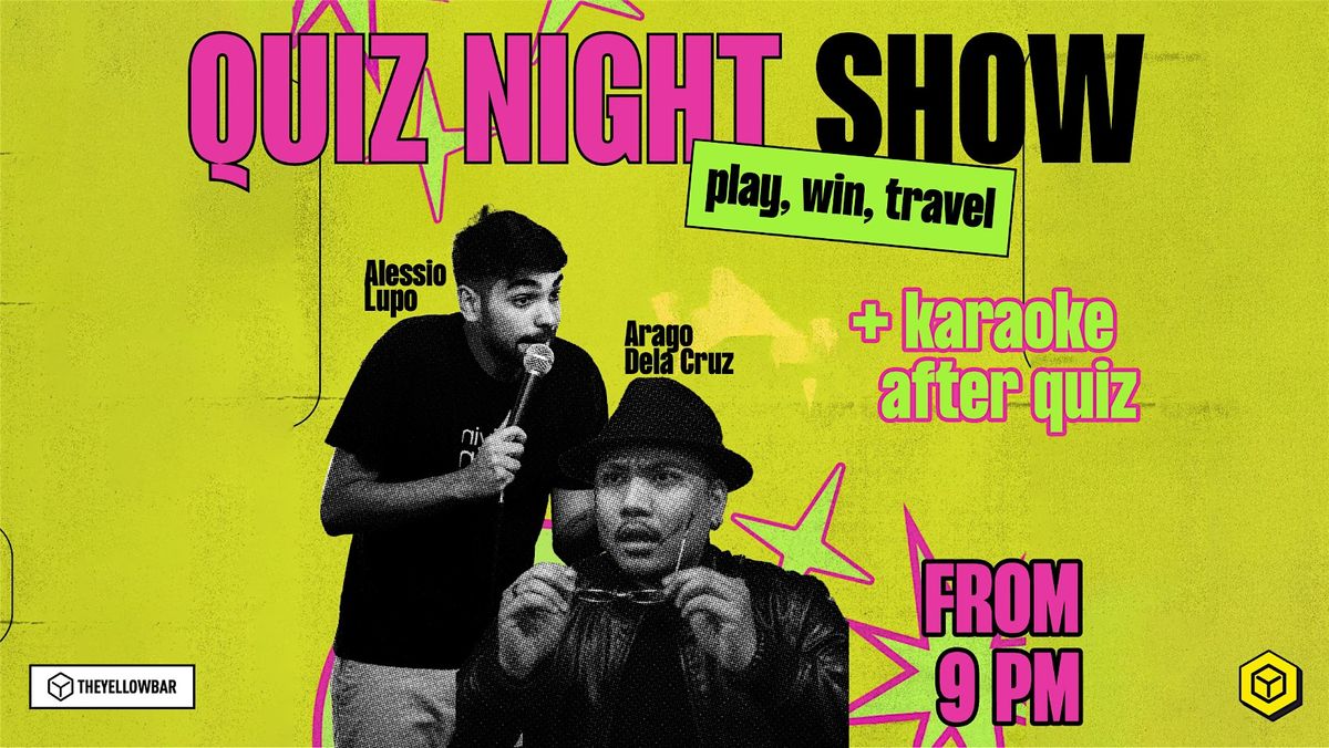 Play. Win. Travel.The Yellow Bar presents a QUIZ SHOW w/ ALESSIO LUPO.Win a free holiday with your knowledge, babyyyy! 🍻(It doesn't get better than this.)Quiz Night Show is an event hosted by Alessio Lupo, a Roman-based comedian from Palermo with a passion for tricky questions. What to xpect? Arago Dela Cruz as a Co-host and Great prizes! From free shot and drinks to travel vouchers for stays across Italy.