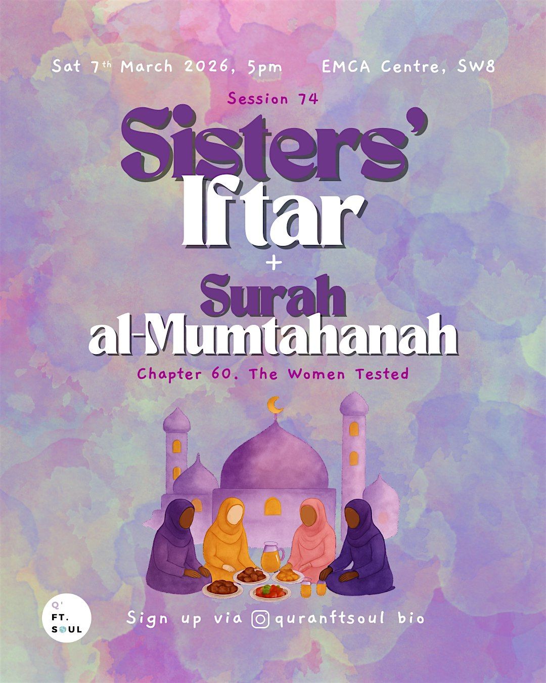Join us for our fourth annual in-person event celebrating 6 years of Qur'an Ft Soul community! This is a Sisters only Iftar event and this will be held at EMCA Masjid.