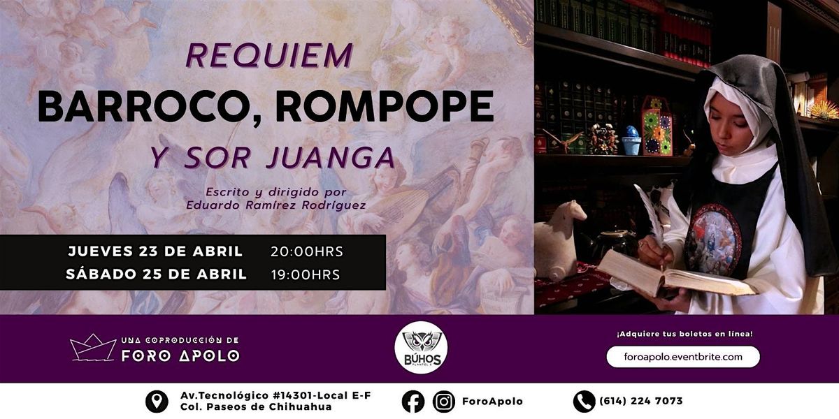 Tres monjas, Sor Inés, Sor Zoila, Sor Presa, a través del sarcasmo y la farsa nos presentan la vida y obra de Juana Inés Ramírez de Asbaje, la también llamada Fénix de México y más conocida como Sor Juana Inés de la Cruz: la poeta más grande del periodo barroco mexicano, filósofa y literata que rompió los estereotipos de su tiempo desafiando a la institución eclesiástica a través de la escritura. • La seriedad se impone brevemente cuando la poesía expresa el sentir de la Décima Musa en sus ya famosos versos y en su interacción con la Virreina María Luisa. • Como de romper esquemas se trata, en este réquiem nadie mejor que Juan Gabriel y sus letras para acompañar la intensidad de la vida de Sor Juana; el Divo de Juárez da nueva vida a esta historia, enlazando el pasado y el presente con una jocosidad e ingenio sin restricciones
