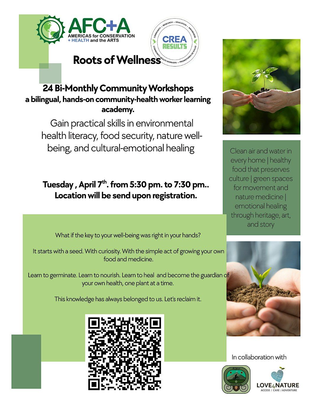 A bilingual, hands-on community-health worker learning academy. Gain practical skills in environmental health literacy, food security, nature well-being, and cultural-emotional healingWhat if the key to your physical and mental well-being was right in your hands?
