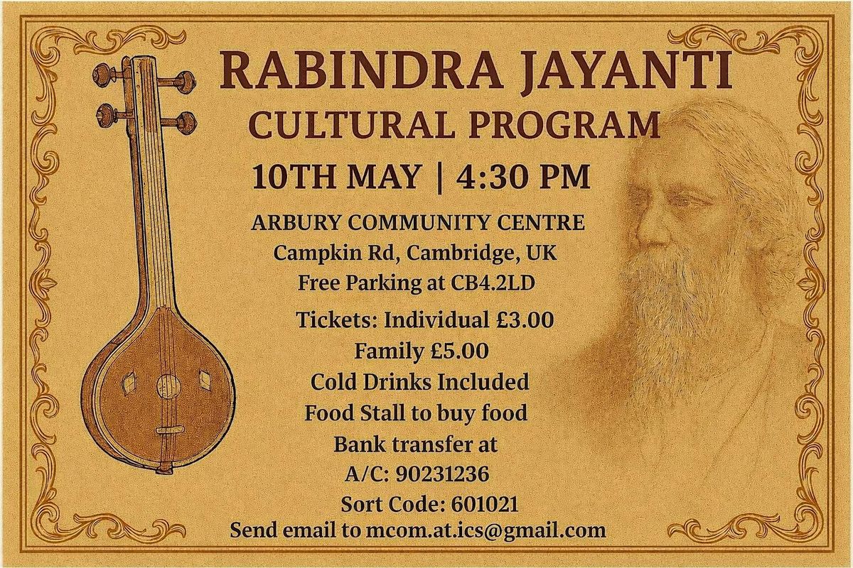 Welcome to our Rabindra Jayanti Cultural Program! Join us at the Arbury Community Centre for a day filled with music, dance, poetry, and more to celebrate the life and works of the legendary poet Rabindranath Tagore. Immerse yourself in the rich cultural heritage of Bengal and enjoy performances by talented artists. Don't miss this opportunity to pay homage to Tagore's contributions to literature and music. See you there!