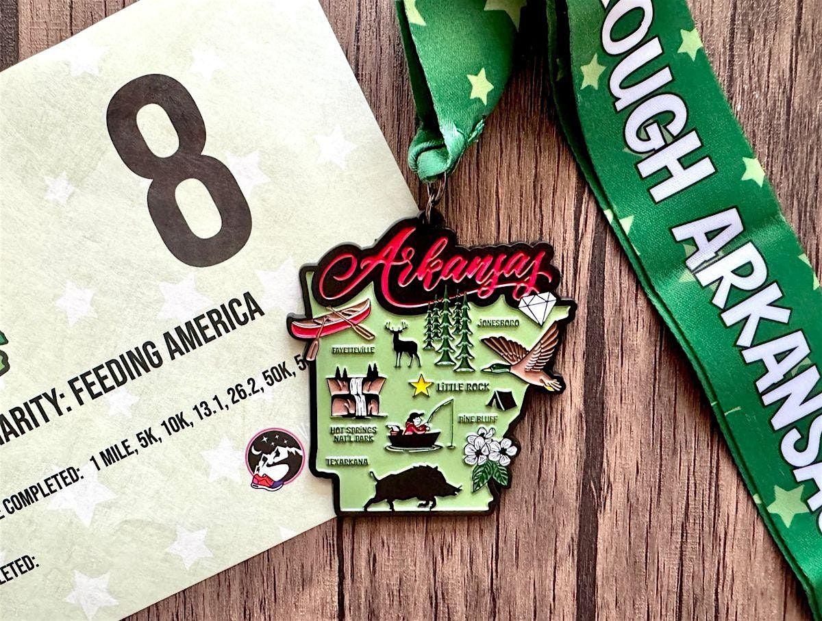 Let's Race Through Arkansas! Our Race Through America Virtual Race Series continues! Each month we will race through a different state, until we've race through all of the states in America! Complete this race anytime!We will be donating 15% of each registration in our Race Through America series to Feeding America, who is the leading domestic hunger relief organization with a nationwide network of 200 food banks. We hope to help feed thousands with our Race Through America Series!