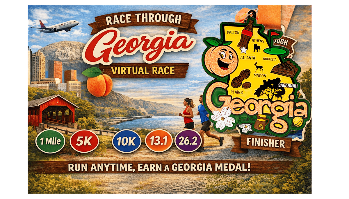 Celebrate the beauty of the Peach State with the Race Through Georgia Virtual Race! Complete your miles anywhere in Georgia—or from anywhere in the world—while staying active and earning a beautiful finisher medal.