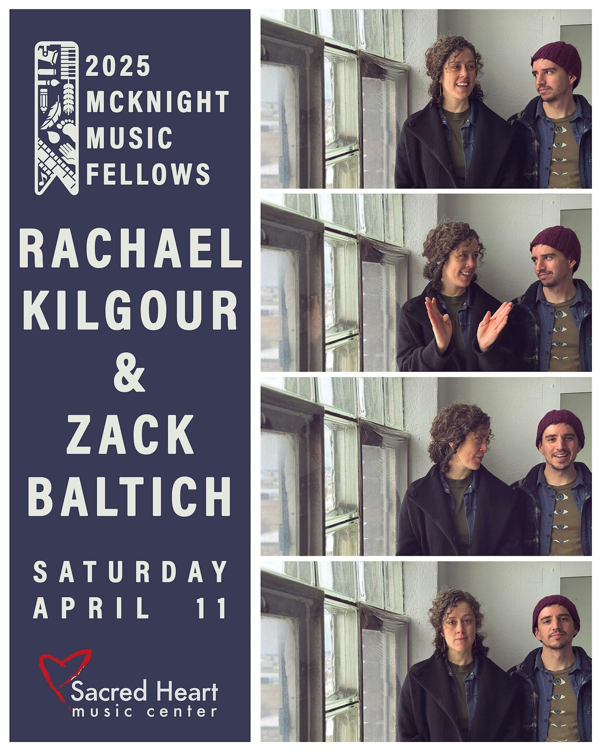 2025 McKnight Music Fellowship award winners Rachael Kilgour and Zack Baltich, both Duluth-based artists, collaborate on a special night of music on the beautiful Sacred Heart Music Center altar stage at 7 pm Saturday, April 11.