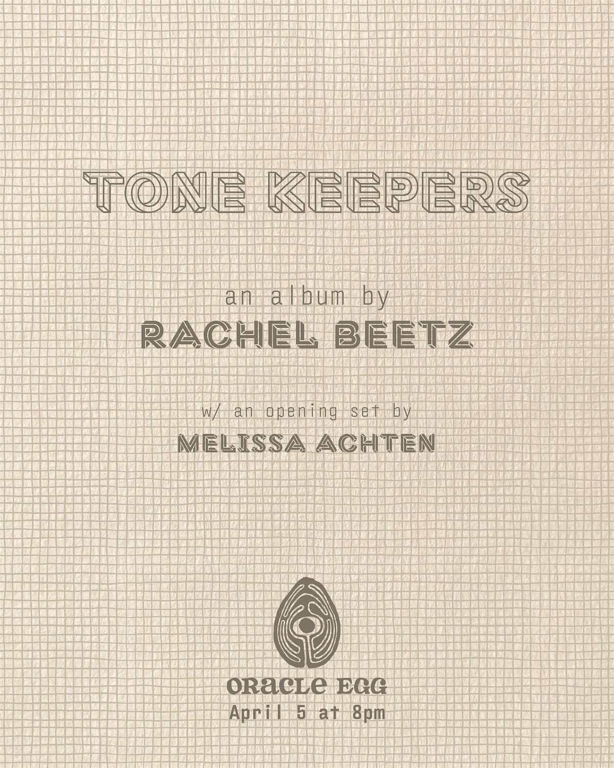 How good does it feel to pull back from time to time? To really shed excess, more-ness, and follow a single path with intention? The exploration of one thing can illuminate corners of the world overlooked by minds pushed in increasingly omnidirectional cycles of want. Tone Keepers is a collection of four compositions by flutist, composer, and sound artist Rachel Beetz that follow a straight line into unexpected territory. Each piece revolves around a simple but inventive technique for generating acoustic sound coupled with a discrete mode of electronic processing, spinning out variations on the unique effect it produces. Beetz encourages sounds to crystalize rather than expand, uncovering new permutations and emotional dimensions as curiosity leads her forward. The ear of the listener becomes a magnifying glass as the mind affixes itself to the music, its focus sharpening with each cyclical return.
