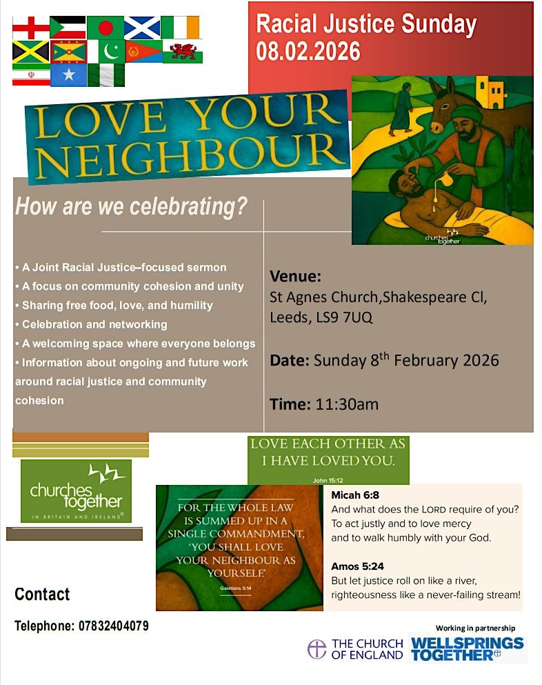On Sunday 8 February 2026, 11:30 am St Agnes Church, Burmantofts, Leeds, working in partnership with Wellspring Together will host a special Racial Justice Sunday celebration, bringing together local churches and community members to reflect, worship, and stand united in love and justice.