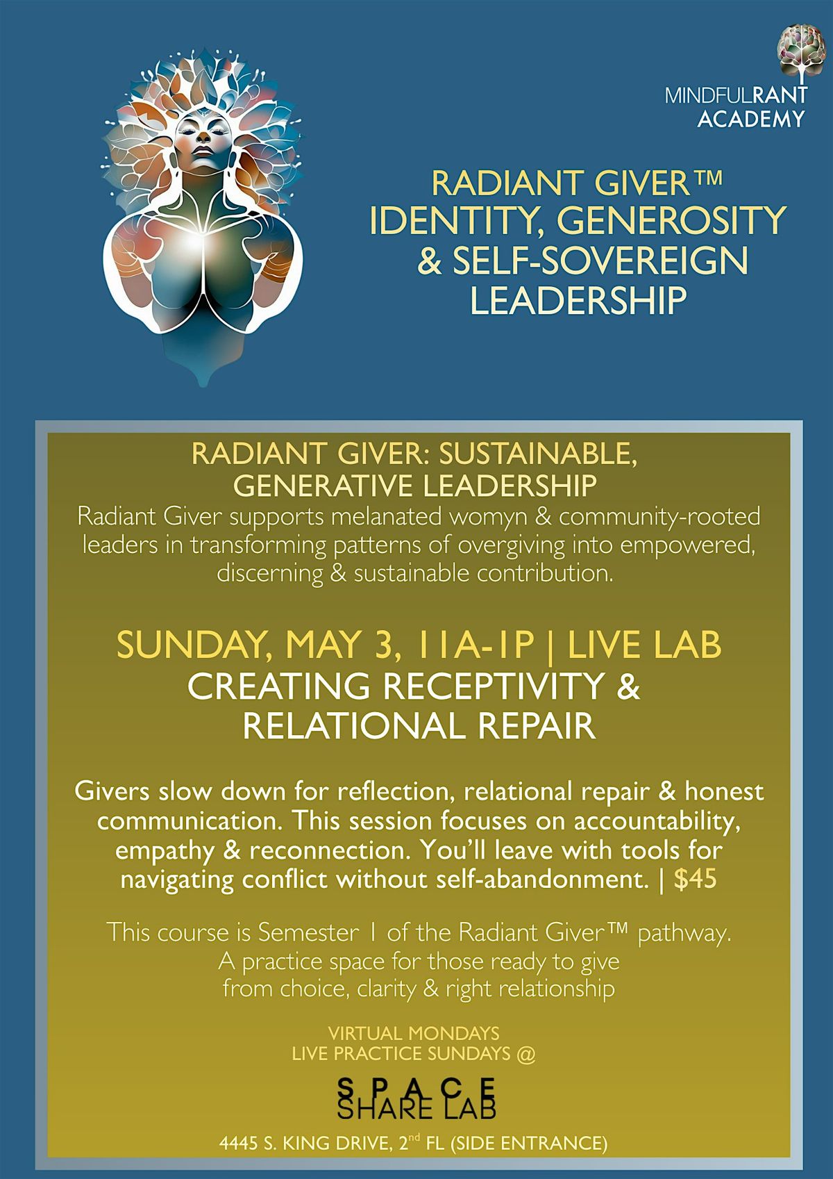 Participants explore how overgiving is shaped by racialized and gendered expectations, faith and service cultures, family systems, professional caregiving roles and community leadership norms. Radiant Giver™ situates burnout and depletion within larger systems vs. the individual and supports participants in redesigning their relationships to work, care and leadership.
