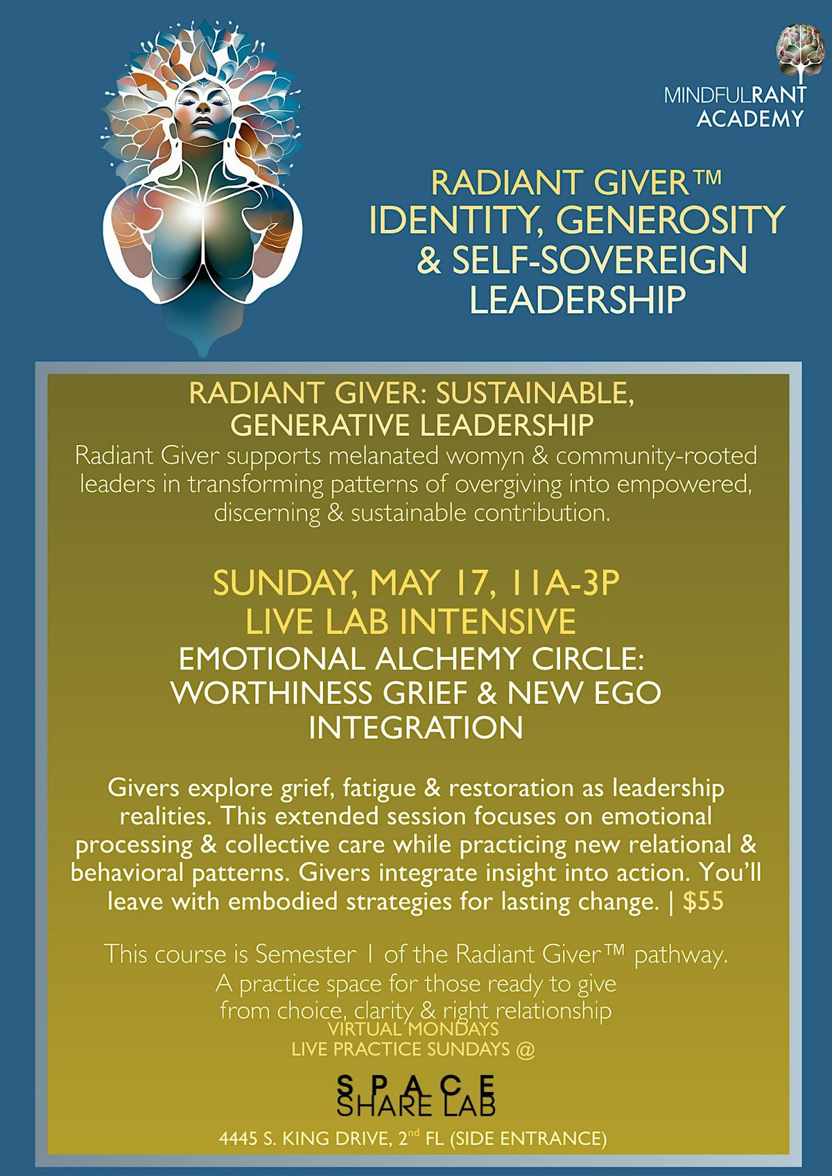 Many participants arrive to this coursework tired, overextended and deeply committed to their communities, families and work. They are often highly skilled, emotionally intelligent and trusted by others, yet rarely resourced in proportion to what they give. Radiant Giver™ is part of the MINDFULRANT Academy™, a learning ecosystem rooted in non-extractive leadership, relational intelligence and sustainable eco-social systems.The Academy and this coursework exists because personal healing organizational health and community transformation cannot be separated.