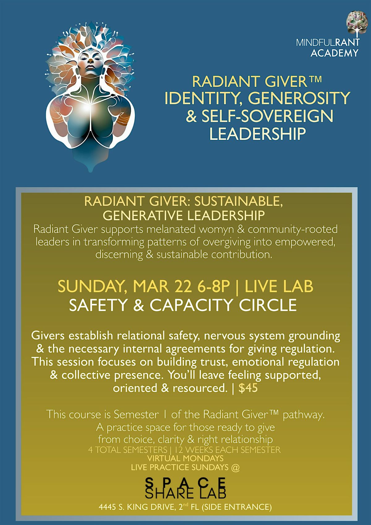 Participants explore how overgiving is shaped by racialized and gendered expectations, faith and service cultures, family systems, professional caregiving roles and community leadership norms. Radiant Giver™ situates burnout and depletion within larger systems vs. the individual and supports participants in redesigning their relationships to work, care and leadership.