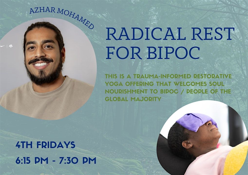 Join us for Radical Rest for BIPOC every last Friday of the month! This trauma-informed offering will include Restorative Yoga, meditation, and community connection.