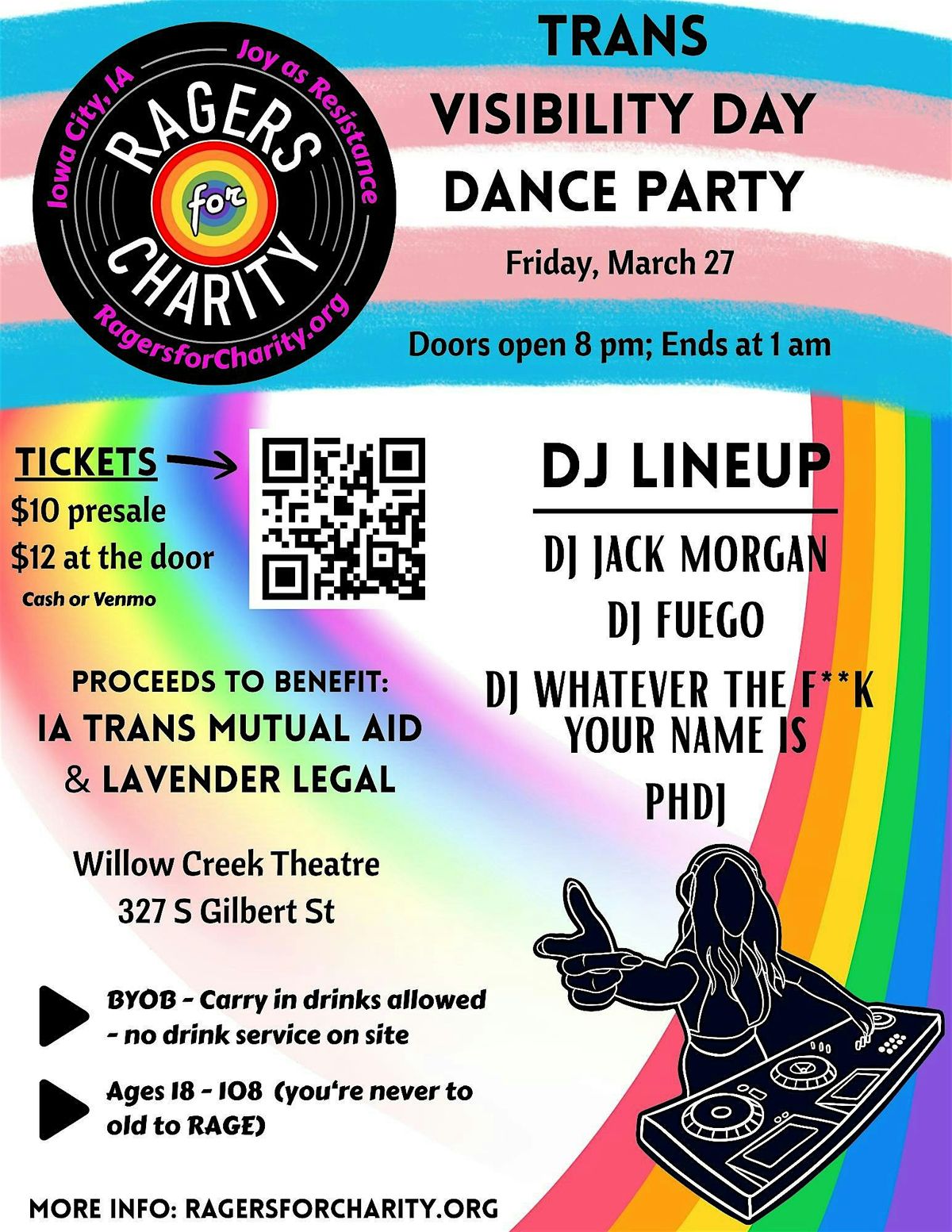 The March ragers features DJ Jack Morgan, DJ Fuego, DJ Whatever the F**k your name is and PhDJ. All proceeds to benefit Iowa Trans Mutual Aid and Lavendar Legal. Doors at 8 PM, music ends at 12:30 AM. Tickets $10 advance, $12 at the door. 18+