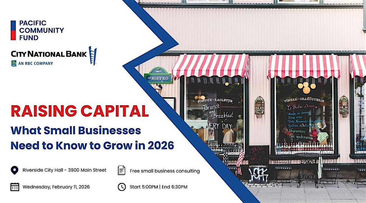 In partnership with City National Bank, Pacific Community Fund (PCF) invites small business owners in the Inland Empire to join us on Wednesday, February 11, for a presentation on raising capital and what to know to grow your business in 2026.