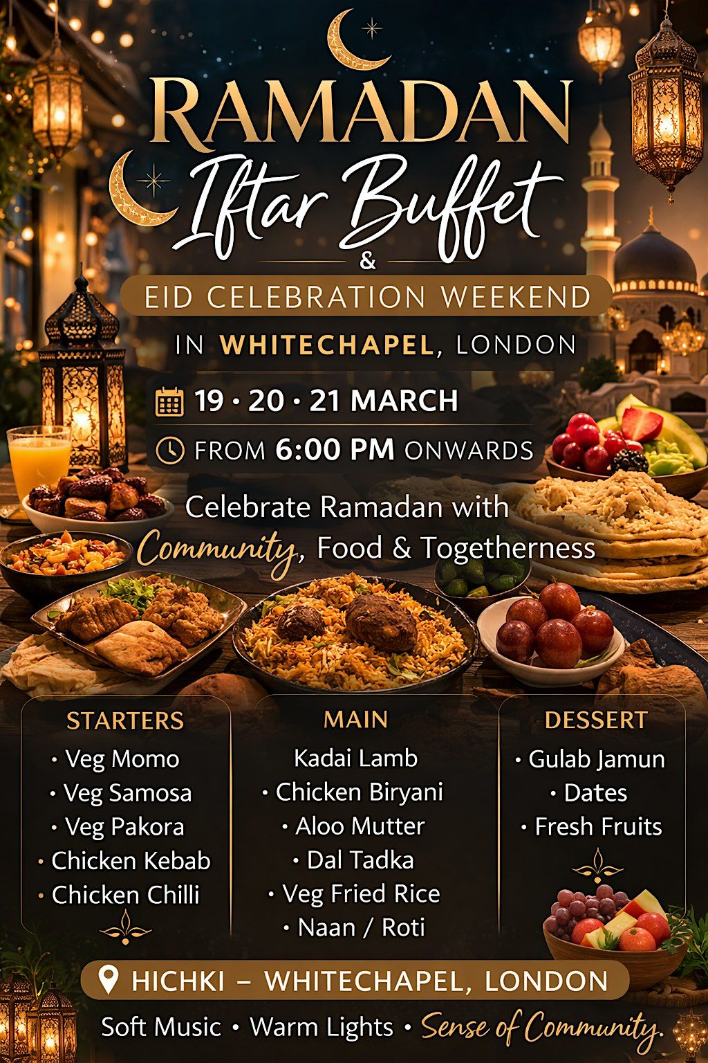 Whether you are a student missing home Iftar, a family looking for a halal Iftar buffet in Whitechapel, or friends wanting to celebrate Eid together, our Ramadan Iftar gathering offers soft background music, warm lighting, and a peaceful atmosphere to create a comfortable space where guests can enjoy Iftar, connect with others, and experience a true sense of community during this special time.