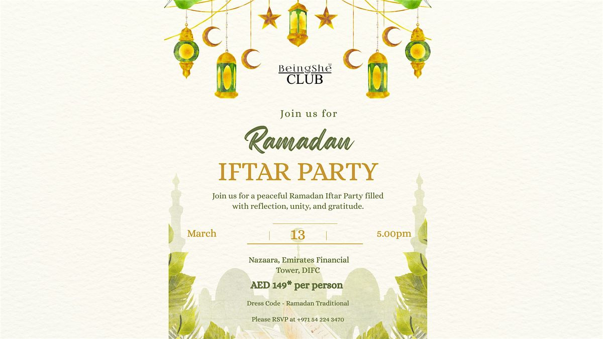 Join us for a relaxed Iftar Party on March 13, 2026 at 5:00 PM (GST)! Come hungry and ready to enjoy delicious food, great company, and a warm atmosphere. It's the perfect way to break your fast and chill with friends. Don't miss out on this awesome evening at Nazaara—we can't wait to see you there!