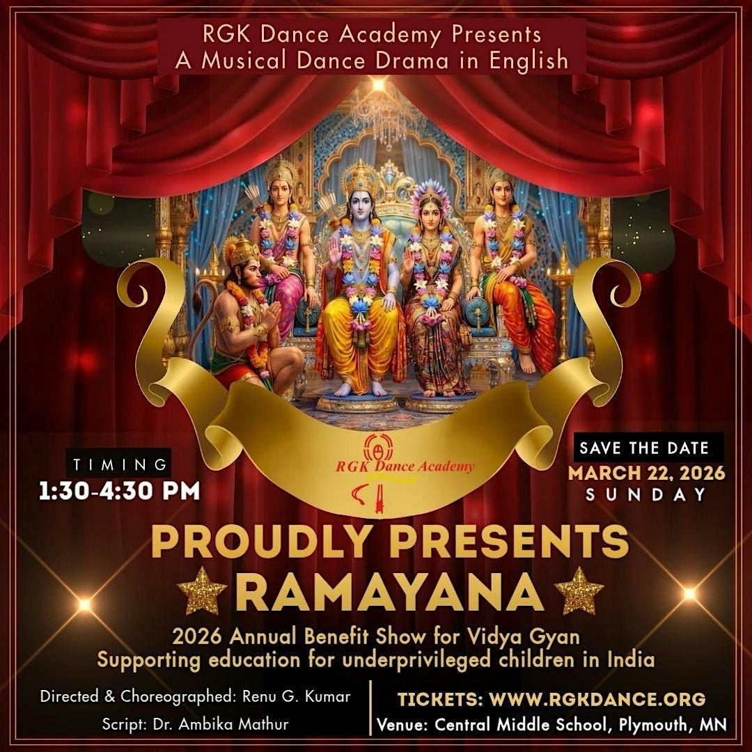 a musical dance drama in English that brings the timeless epic to life through dance, music, and storytelling. Celebrating RGK’s 23rd Anniversary, this family-friendly benefit show supports Vidya Gyan, helping under-resourced children in India & USA.