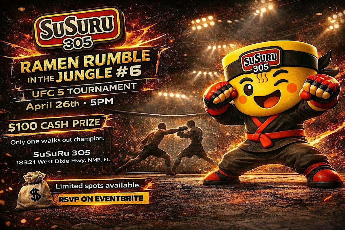 Welcome to the Ramen Rumble In The Jungle#6! 🍜 A Susuru 305 - UFC 5 Tournament happening at Susuru 305! Get ready to Battle it out with your friends while enjoying delicious ramen, exotic snacks, and exotic beverages!