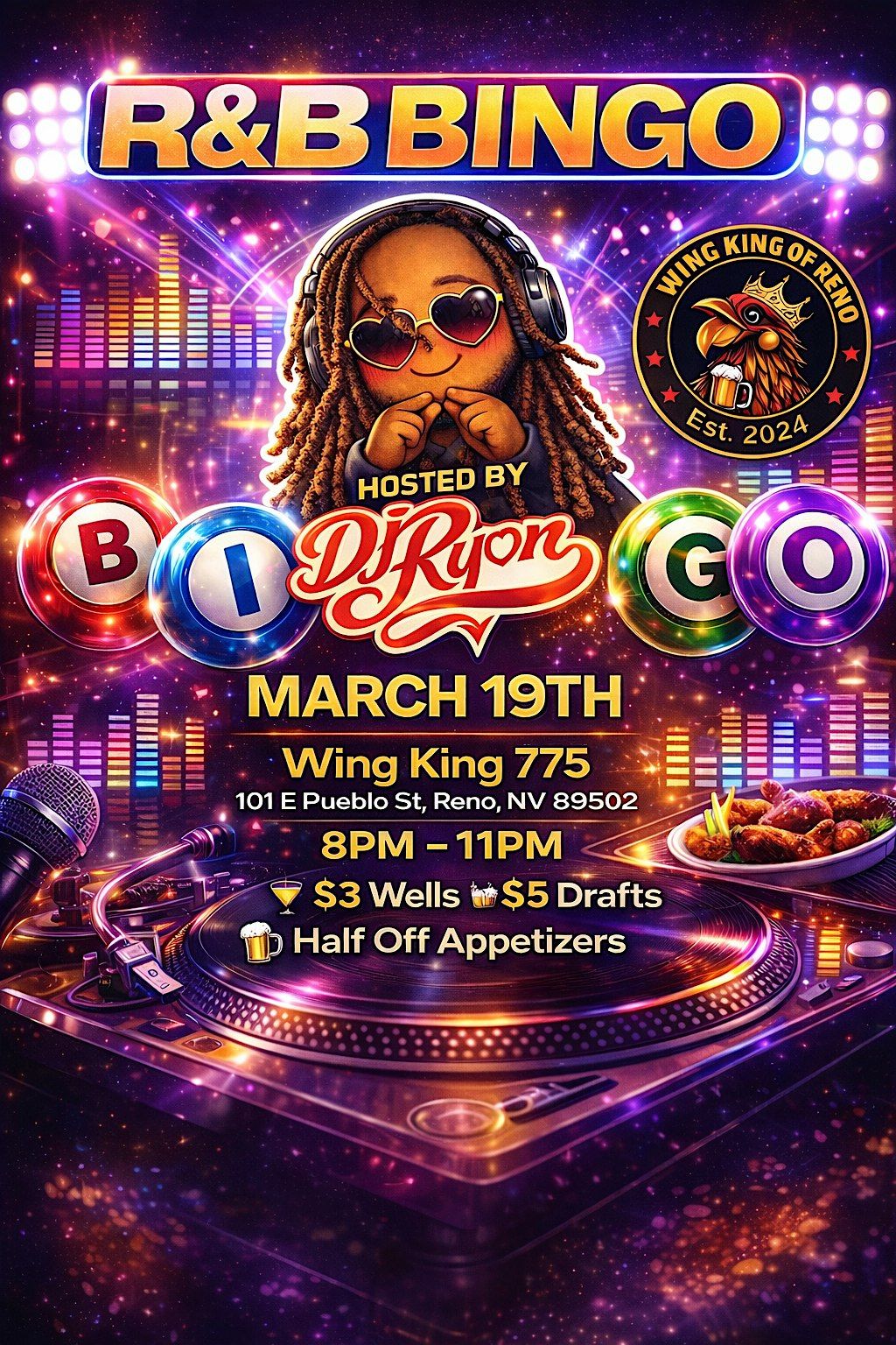 Join us at WING KING 775 on March 19, 2026 at 8:00 PM (PDT) for a fun night of bingo with an R&B twist. Bring your friends, enjoy great vibes, and see if you can shout Bingo! first. It's all about good music, good times, and good company. Don’t miss out! $3 Wells $5 drafts and Half off Appetizers all night.