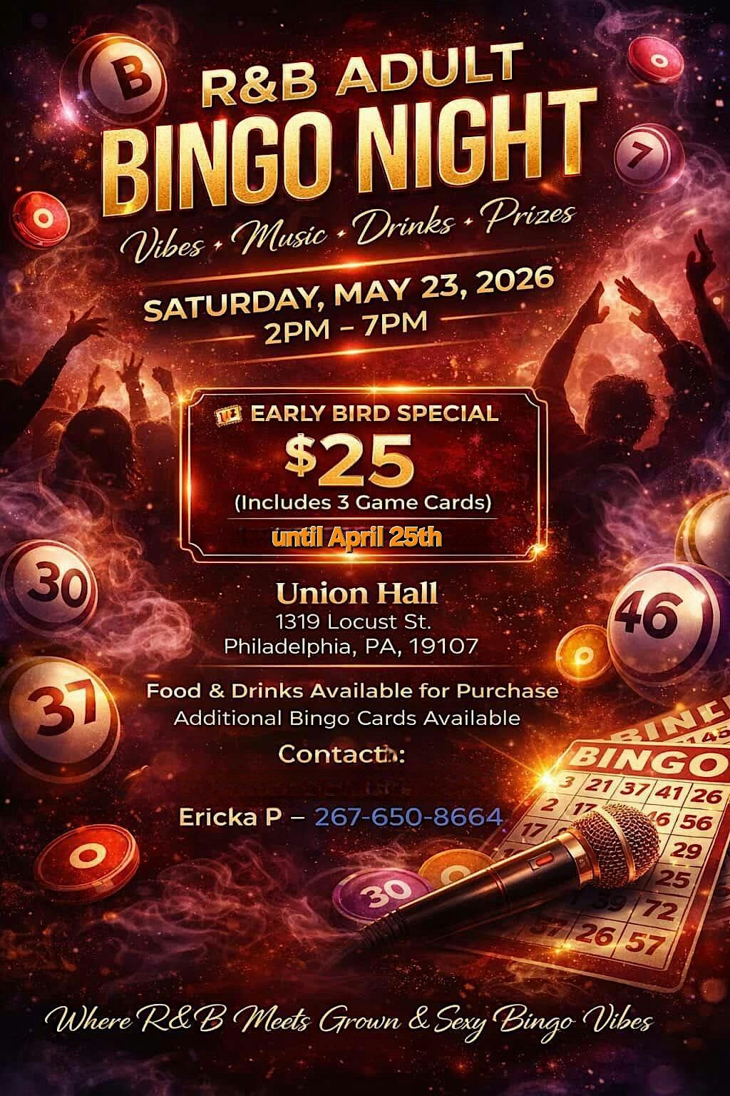 Join us in person for an epic evening filled with your favorite R&B jams and a fun twist on classic bingo. Bring your vibes, your friends, and get ready to shout BINGO! as we groove through some smooth beats and exciting rounds. It’s the perfect way to chill, compete, and connect. Don’t miss out on the coolest game night in town!
