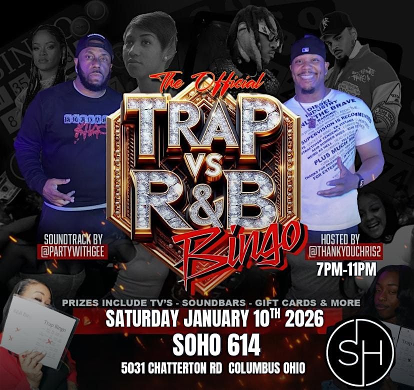Welcome to R&B BiNGO COLUMBUS! Get ready for a night of music, fun, and games at SOHO 614. Join us on Sat January 10TH 2026 at 7pm for R&B Vs Trap Bingo with the one and only THANKYOUCHRIS & PARTYWITHGEE. It's going to be a night to remember, so bring your friends and get ready to dance, sing, and win some awesome prizes. Don't miss out on this epic event!