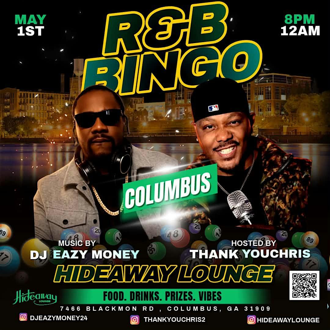 Welcome to R&B BiNGO Columbus GA! Get ready for a night of fun and laughter at our R&B Vs Trap Bingo event with comedian THANK YOU CHRIS! Join us at Hideaway Lounge on FRIDAY MAY 1st 2026 at 8:00 PM for a one-of-a-kind experience.