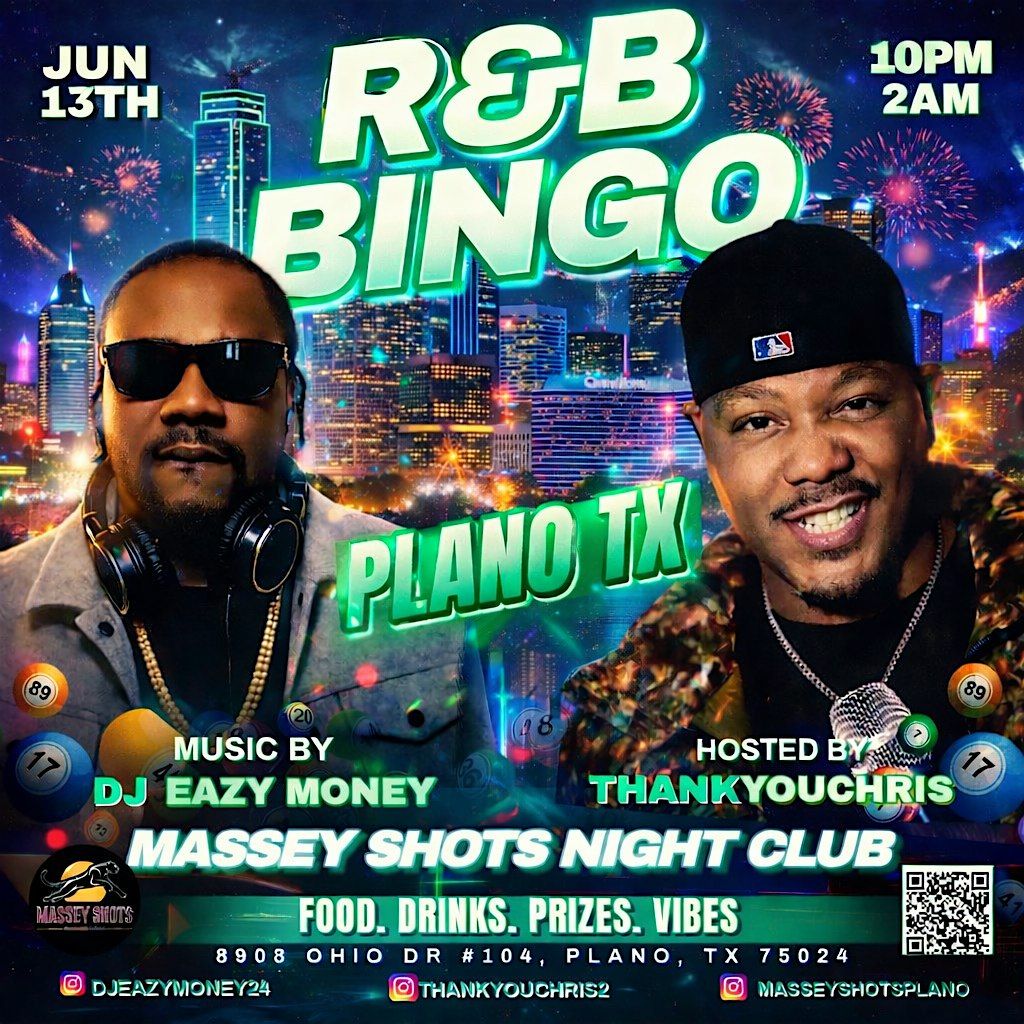 Welcome to TRAP Vs. R&B BiNGO Plano TEXAS! Get ready for a LIT ASS NIGHT at MASSEY SHOTS on March 28TH, 2025 at 10:00 PM.