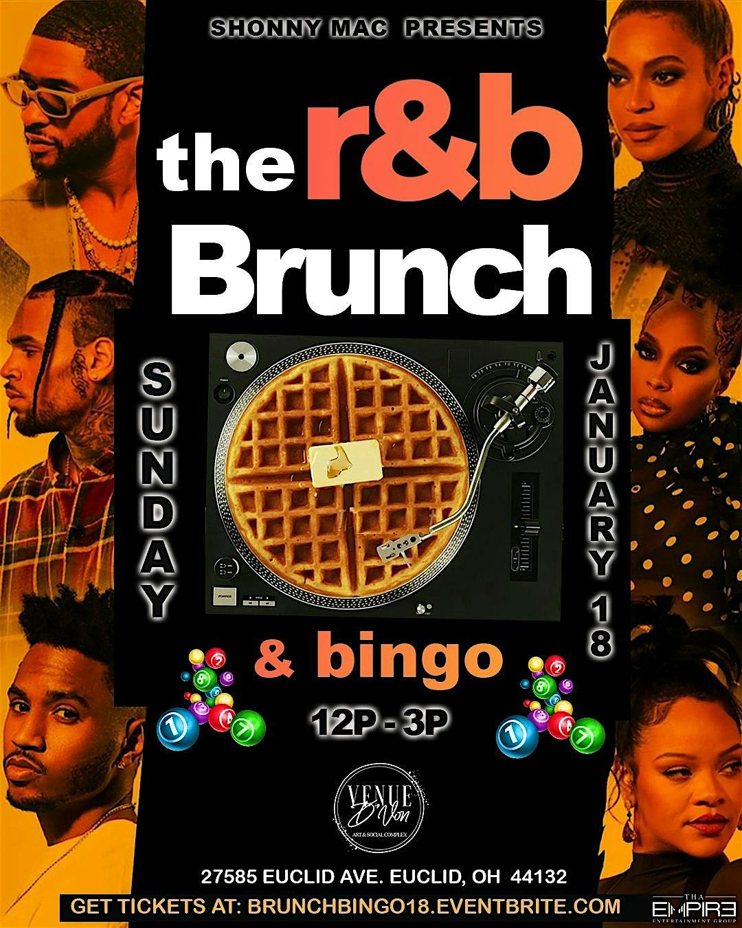 Welcome to R&B Bingo & Brunch! Join us at Venue D'Von for a fun-filled event of music, bingo, and delicious brunch. Get ready to sing along to your favorite R&B and Hip hop classic tunes while checking all the artists on your bingo boards for a chance to win exciting prizes. Indulge in a delicious brunch including a spread of bacon, sausage, eggs, potatoes, chicken & waffles, grits, fruit, & beverages. Complimentary Mimosas (courtesty of Tha Empire Ent) while enjoying the sounds of Host DJ Shonny Mac. There will be 3 rounds of naming & singing the artists & tunes on your boards with winning prizes of gift cards & gift bags. Don't miss out on this unique experience! Come hungry and leave happy at our R&B Brunch & Bingo !