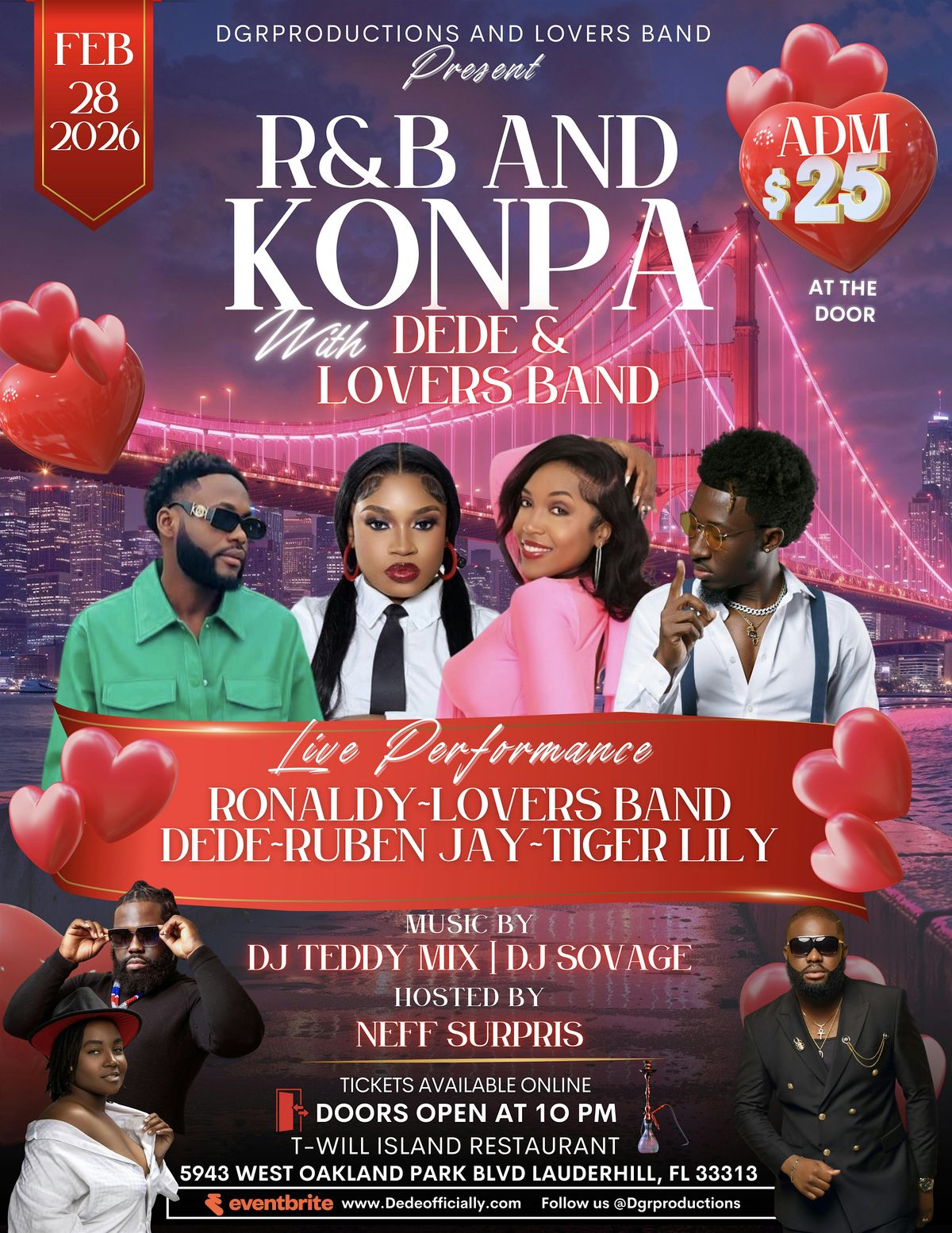 This event celebrates the spirit and excitement of music in a environment designed to showcase the richness and diversity of the Haitian international music industry. With the theme "R&B AND KONPA," DGR PRODUCTIONS and LOVERS BAND aims to bring together the music community in a fashionable style that promotes local talent, inspires artist collaboration, and provides an unforgettable experience for attendees.