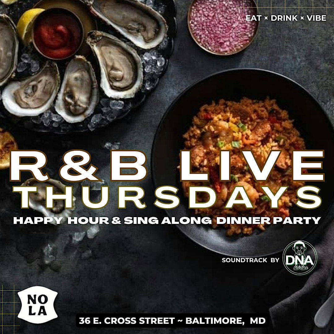 Join us Thursday; March 12th, for the cities #1 weekly vibe , R&B Live Sing Along Dinner party @ Nola Seafood in the heart of Federal Hill. Get ready to eat, dance, sip & sing along during an ultimate R&B Dinner experience. Join us for a dinner Party like no other, where delicious food meets infectious beats. It's time to turn your Thursday evening into an unforgettable memory featuring a special R&B set by Dj DNA!
