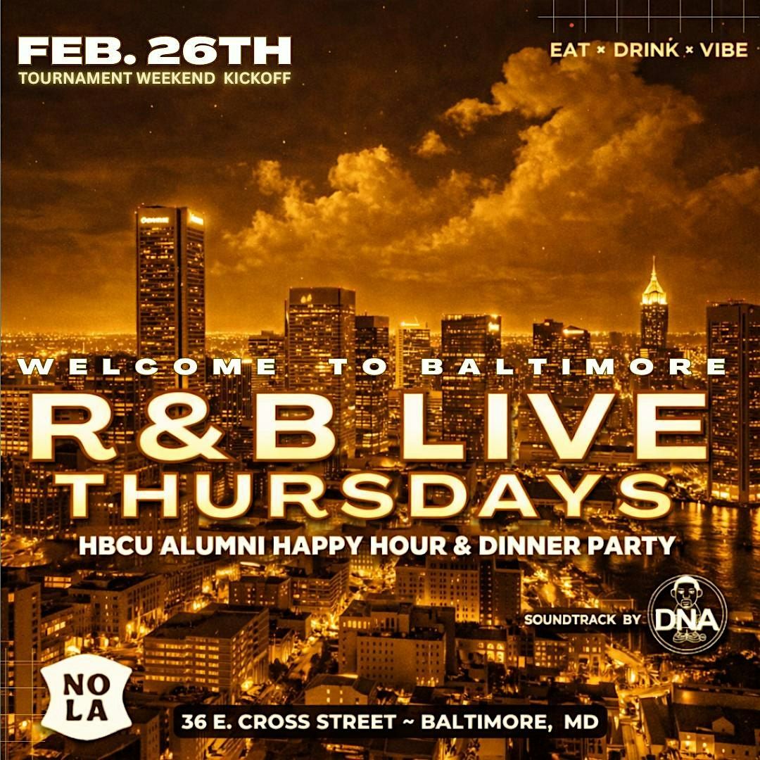 Join us Thursday; February 26th, for the CIAA Tournament Weekend Kickoff as we welcome all HBCU Alumni to Baltimore at the cities #1 weekly vibe , R&B Live Sing Along Dinner party @ Nola Seafood in the heart of Federal Hill. Get ready to eat, dance, sip & sing along during an ultimate R&B Dinner experience. Join us for a dinner Party like no other, where delicious food meets infectious beats. It's time to turn your Thursday evening into an unforgettable memory featuring a special R&B set by Dj DNA!