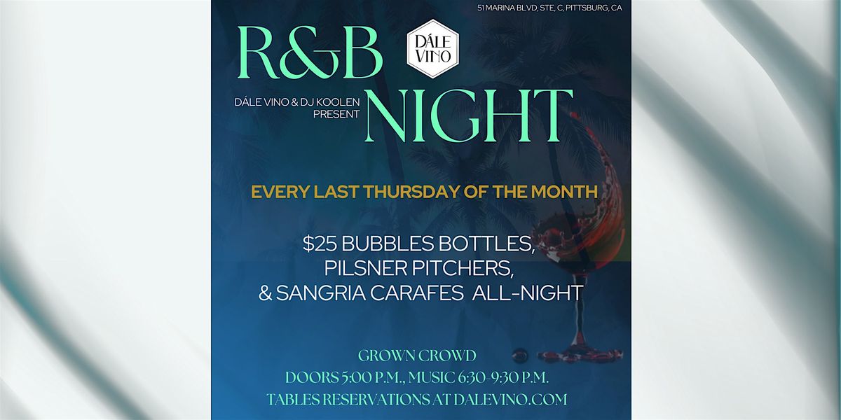 R&B night at Dále Vino is back! This kickback evening features the one and only DJ Koolen playing all pure R&B with fresh spins, throwback, old-school, and more.