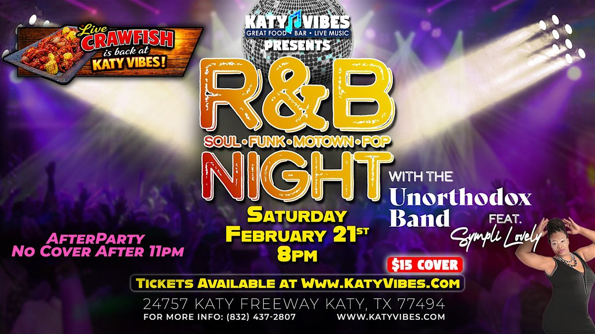 #RBNight #UnorthodoxBand #SympliLovely #SoulMusic #Funk #Motown #PopMusic #LiveMusic #KatyTX #LiveCrawfish #VibeStronger