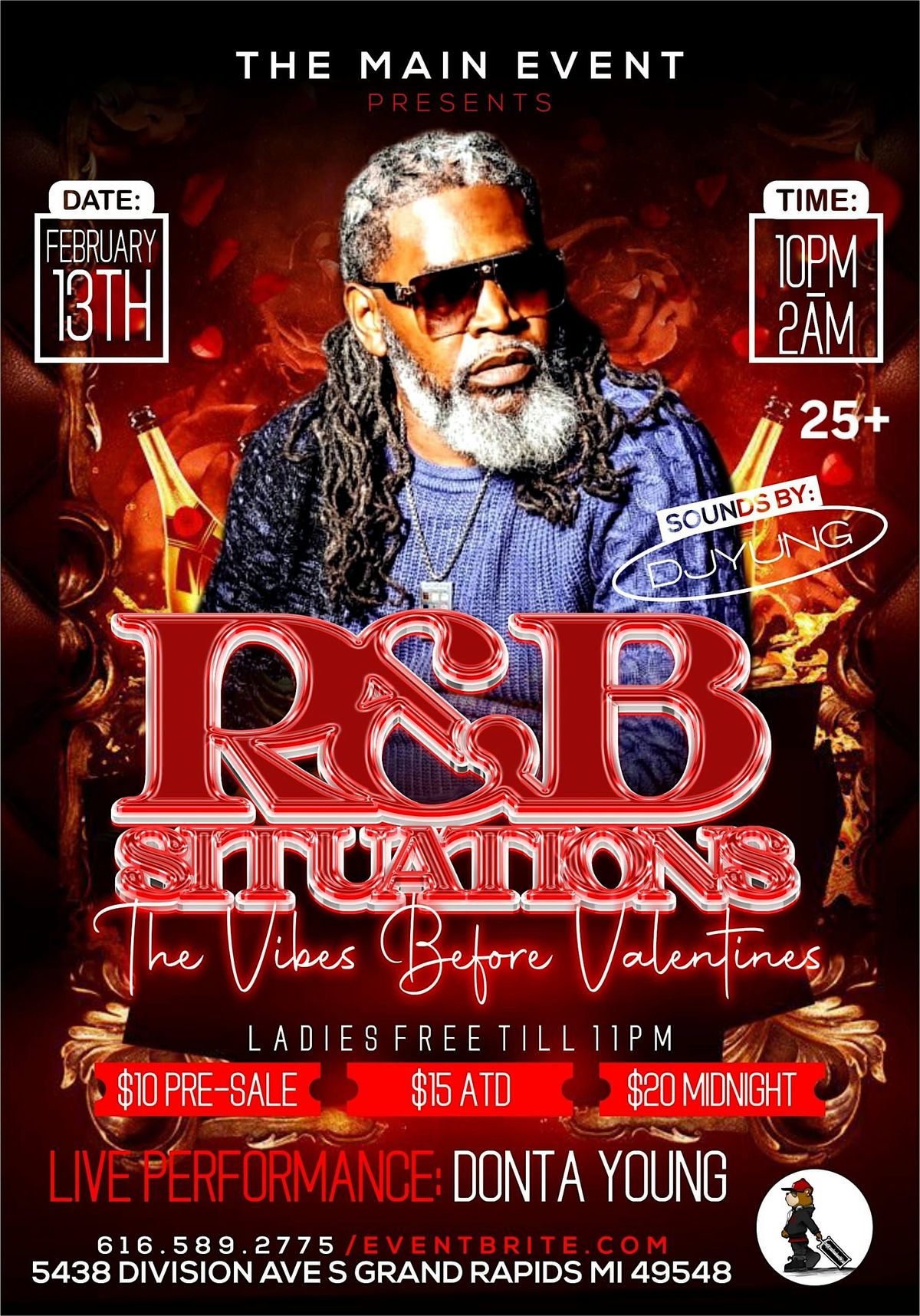 Join us for a night out of your favorite R&B Jamz from Old To New...SameHost and same Vibes powered by THE MAIN EVENT....good energy And Big Vibes all night...This Month we will Be Celebrating Love,Life And Happiness at our pre- Valentines R&B Bash... So if you love R&B This night out is for you....Live performance by Dontae Young! He will be blessing us with with his smooth R&B Melodies and Grand Rapids talents so make sure you don't Miss this! So get sexy and come represent in a splash Of Red,White,Black or Pink making a statement on Lovers Eve!