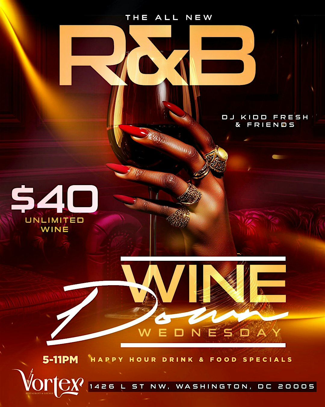 Welcome to R&B Wine Down Wednesdays — a midweek vibe where smooth R&B meets elevated lounge energy at Vortex Restaurant & Lounge.