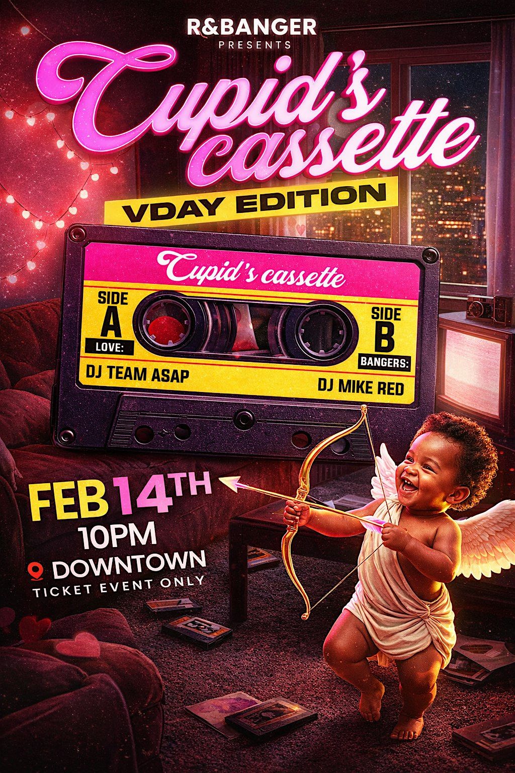 Cupid’s Cassette: V-Day Edition is a Valentine’s Night R&B experience blending love songs and bangers. Featuring DJ Team ASAP on Side A (Love) and DJ Mike Red on Side B (Bangers). A nostalgic cassette-themed party with high energy, romantic vibes, and nonstop music. Feb 14 • 10PM • Downtown. OPEN BAR 10pm-11pm (Ticket event only. 💘🎶)