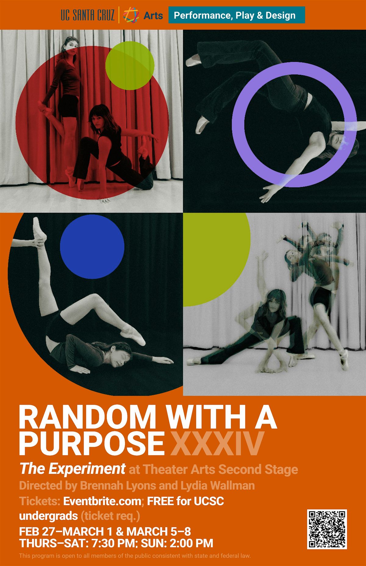 Join us for the annual student-directed and student-choreographed dance production, Random With a Purpose XXXIV: The Experiment, presented by the Department of Performance, Play & Design at UC Santa Cruz.