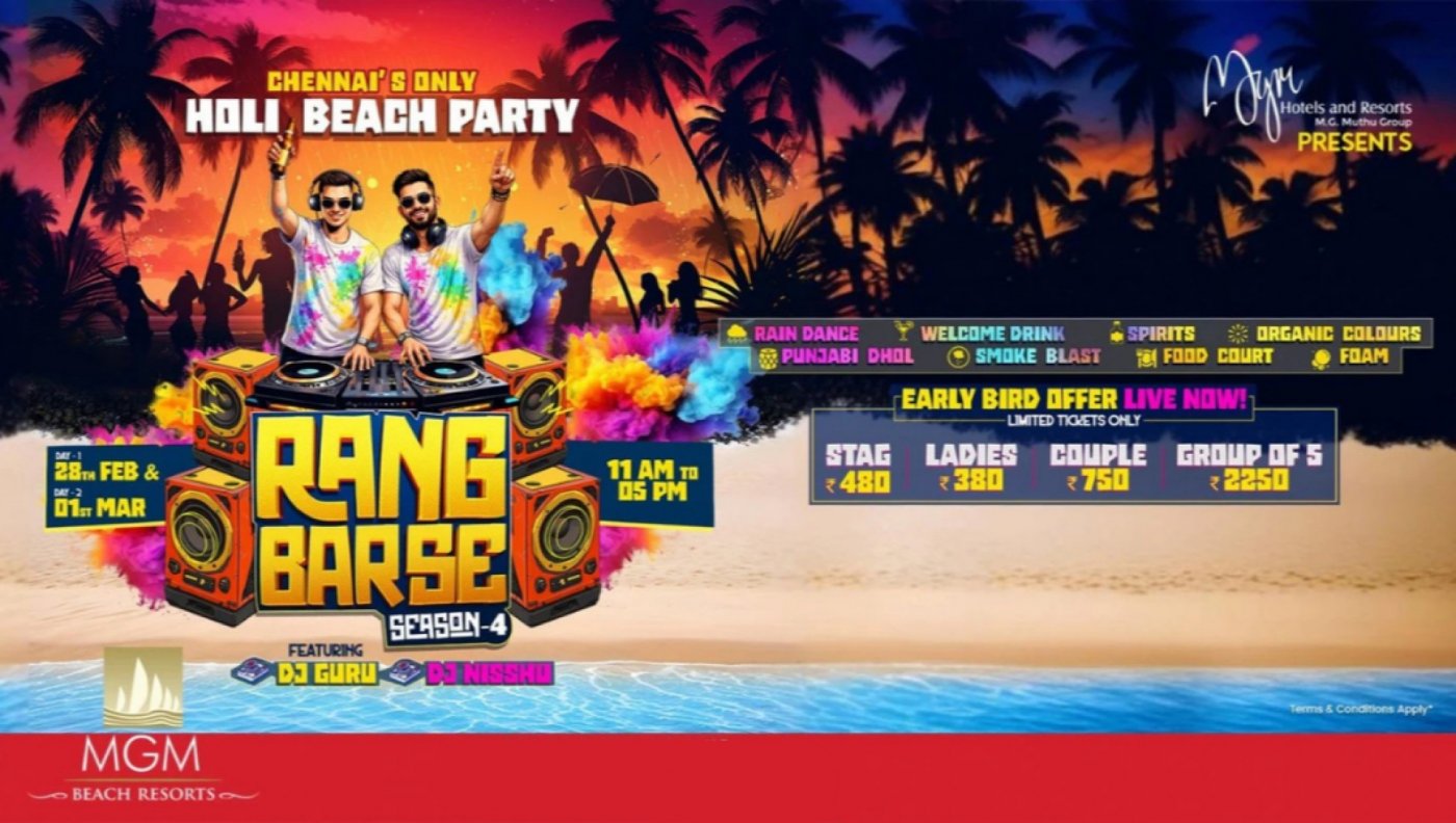 Picture this, vibrant organic colours, thumping beats, unlimited fun, rain dance, foam, and the ocean breeze setting the perfect vibe for a high-energy Holi bash, with one hand holding a drink as you sip by the beach. With live DJs spinning nonstop, Punjabi dhol beats, smoke blasts, and beachside party energy, Rang Barse Season 4 is the ultimate way to celebrate Holi in Chennai.